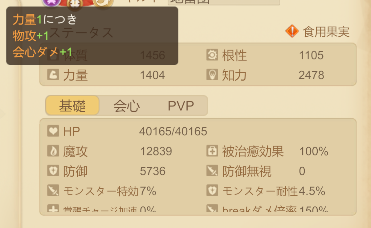 自分のステータスが低いなーと思う場合は、上記のどれかを調整していく事で自分の思い描くステータスに近づけていくのがキャラ強化に繋がります。
